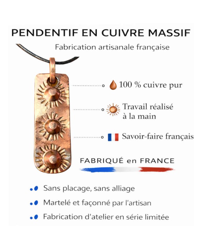 Chaque pièce est façonnée entièrement à la main, de la plaque de cuivre jusqu’aux finitions. Le pendentif est martelé à la main par un artisan, y compris l’anneau d’accroche, lui aussi réalisé en pur cuivre massif, sans aucun élément plaqué ni alliage.