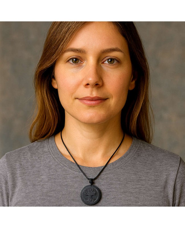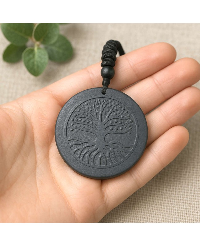 Pendentif en shungite naturelle et pierre de lave, gravé d’un magnifique Arbre de Vie. Un bijou énergétique idéal pour la protection contre les ondes, l’ancrage et le bien-être. Modèle rond de 4 cm avec cordon ajustable.